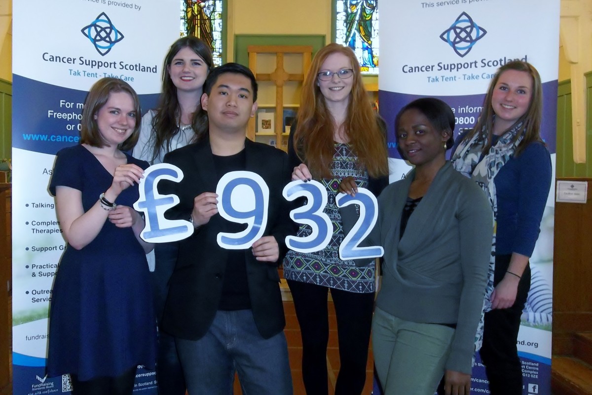 Glasgow University Cancer Support Scotland Society was started by student Melanie Patrick just over 9 months ago and has already made such a difference to Cancer Support Scotland. Melanie, with fellow group members Heather Corley, Tony Hon, Catriona Quinn, Aduku Obilor, Calum Lavery, Morgan McTiernan and Jessica To, the group has not only raised awareness of Cancer Support Scotland but also a fantastic £932 to go towards our support services.