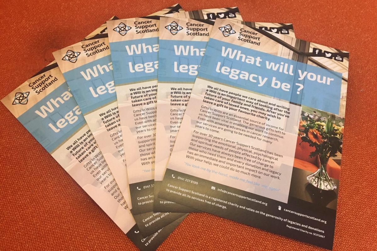 By leaving a gift in your will to Cancer Support Scotland you can help change the lives of hundreds of people affected by this life changing disease. It is the single biggest tribute we can receive. We launched our new legacy leaflet at our AGM last month so please look out for them when you next visit the Centre or ask for one to be posted out to you.